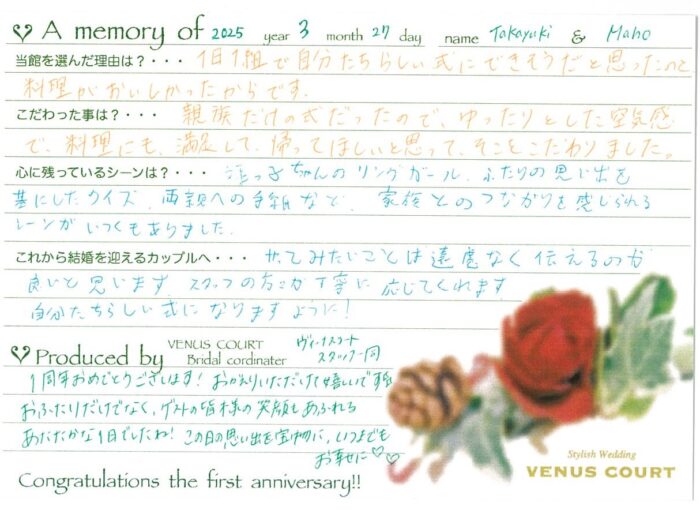 2025年3月に挙式をされたおふたりがファーストアニバーサリーにお帰り頂きました!