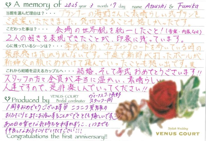 2025年3月に挙式 をされたおふたりがファーストアニバーサリーにお帰り頂きました!