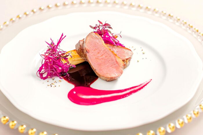 《北海道産仔牛の背肉のステーキ。 マデラーソースにマスタードを加えたさっぱりとしたソースでお楽しみいただきます。》