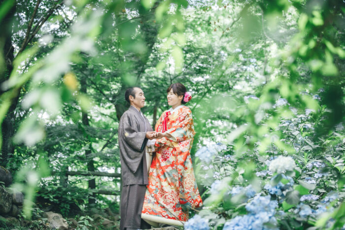 新緑もですが、今回はギリギリところどころあじさいもありお二人の和装にとってもあってますよね!!