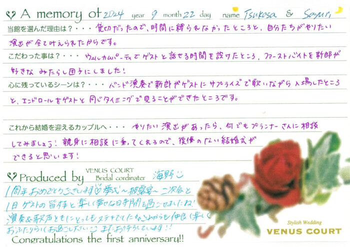2024年9月に挙式をされたおふたりがファーストアニバーサリーにお帰り頂きました!