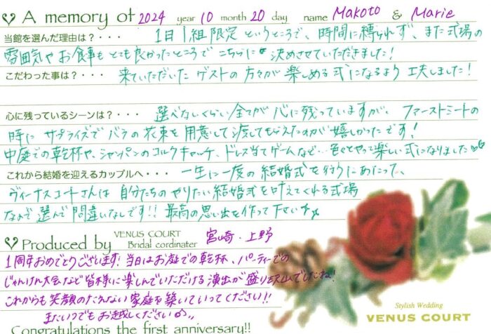 2024年10月に挙式をされたおふたりがファーストアニバーサリーにお帰り頂きました!