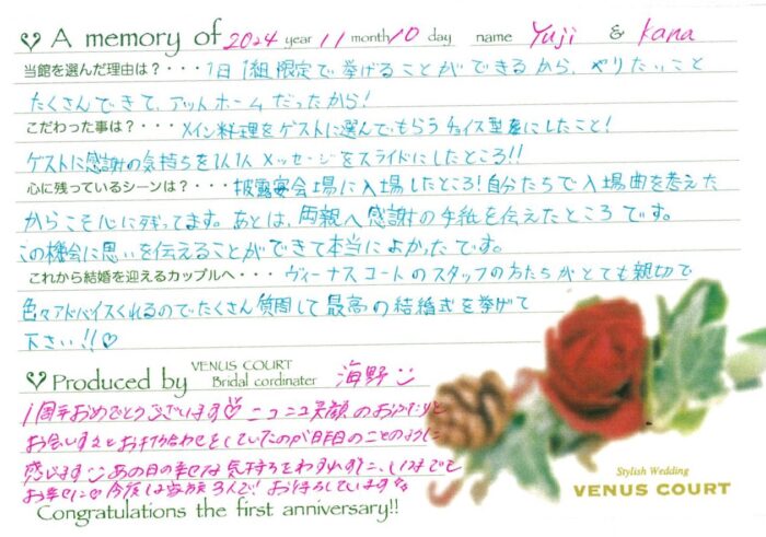 2024年11月に挙式をされたおふたりがファーストアニバーサリーにお帰り頂きました!