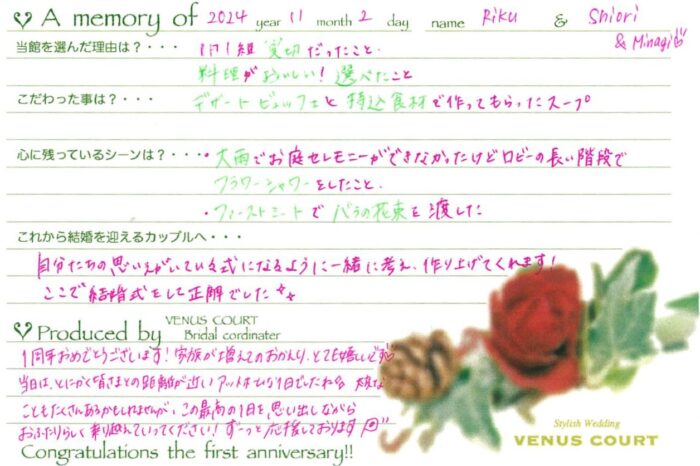 2024年11月に挙式をされたおふたりがファーストアニバーサリーにお帰り頂きました!