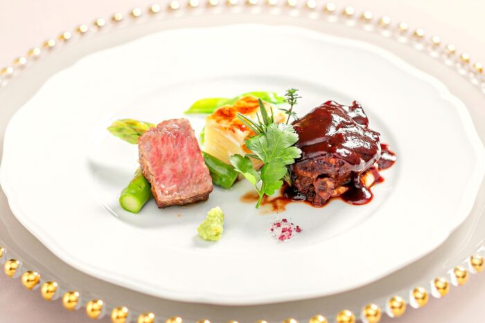 《旨味成分が豊富な信州プレミアム牛サーロインステーキともも肉を赤ワインを使用してじっくりと時間をかけて煮込んだ赤ワイン煮込み両方をお楽しみ頂けます。》
