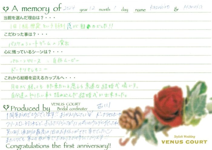 2024年12月に挙式をされたおふたりがファーストアニバーサリーにお帰り頂きました!