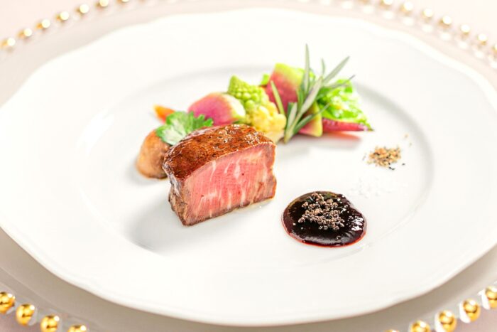 《旨味成分が豊富な信州プレミアム牛のステーキです。 季節により変わる温野菜と一緒に召し上がります。》