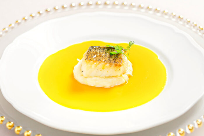 すずきのロースト 西洋ねぎとキャロット風味のオレンジソース