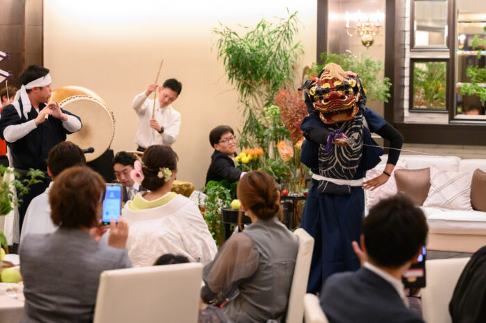 おふたりが和装の間にはテーブルごとのお写真タイム📷、しょうごさんの地元の伝統的な獅子舞の余興もありました!