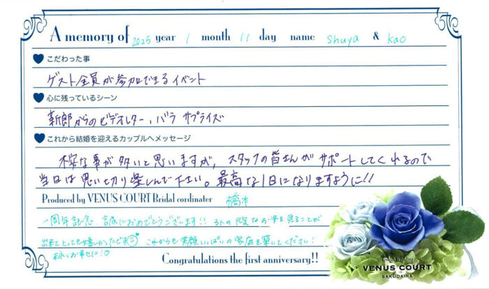 2025年1月に挙式をされたおふたりがファーストアニバーサリーでお帰り頂きました!